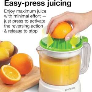 Proctor Silex Electric Citrus Juicer Machine, Large 34 oz. Pitcher, Pressure Activated, 2 Reamers for Big and Small Fruit, Pulp Control, for Orange, Lemon, Grapefruit Juice, White & Green (66340)
